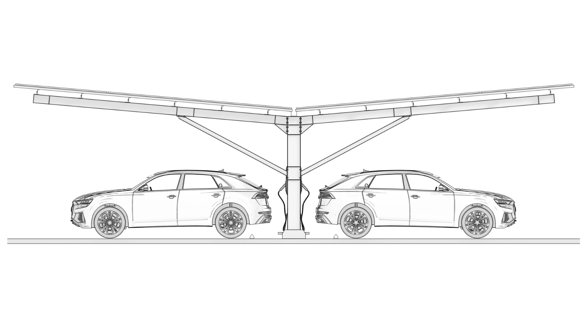 Single-row solar carport model with a vertical brace to provide durability and accessibility to the system.